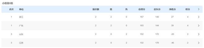 Ⅱ小组只有四支球队,形势比较明朗。广东队和浙江队的实力明显要比山东队和江苏队强,这两支球队也都取得了两战全胜的战绩,排名小组前两位。接下来的最后一场比赛,广东队将会和浙江队直接对话,这场比赛将会决定哪支球队排名小组第一。至于山东队和江苏队,这两支球队的阵容厚度都不足,基本上只能排名小组第三和第四了。两支球队也会在最后一轮比赛中直接对阵,山东队获得第三名的希望还是比较大的,至于能否晋级八强,就要看最后的整体排名情况了。